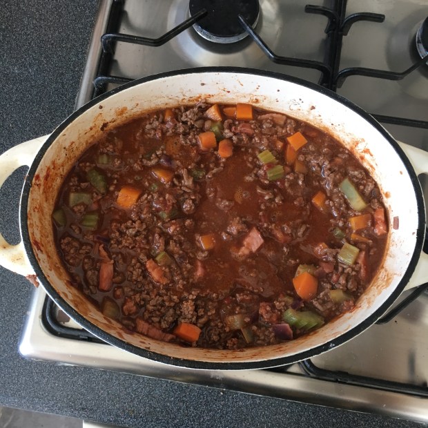 I’ve got my oldest girls coming for a three course meal on me and I’ve just realised I’ve made this for them before! So I’ll go back to the drawing board. But, for now, I must talk about this heady, savoury dish which has a rich, meaty punch. Please excuse the previous sentence- I sound like a right knob. This ragu has loads of happy memories. Well apart from the time I sliced the corner of my finger off with a mandolin- it grew back though and as long as you deglaze the pan with a chunk of finger you’re grand.