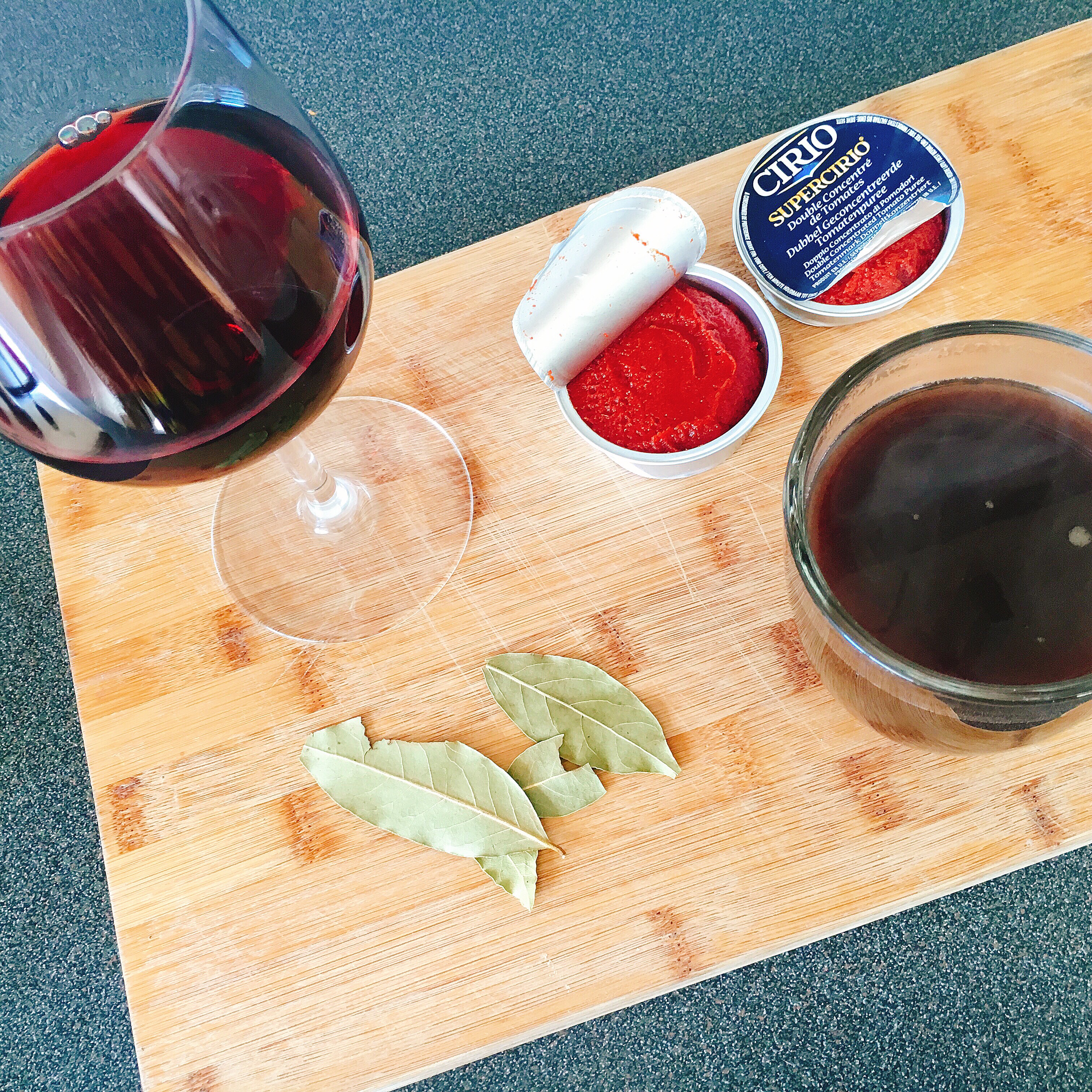3. Brown your meat in batches. Then add the red wine and burn off the alcohol. Stir in the purée then add the stock and bay leaves.