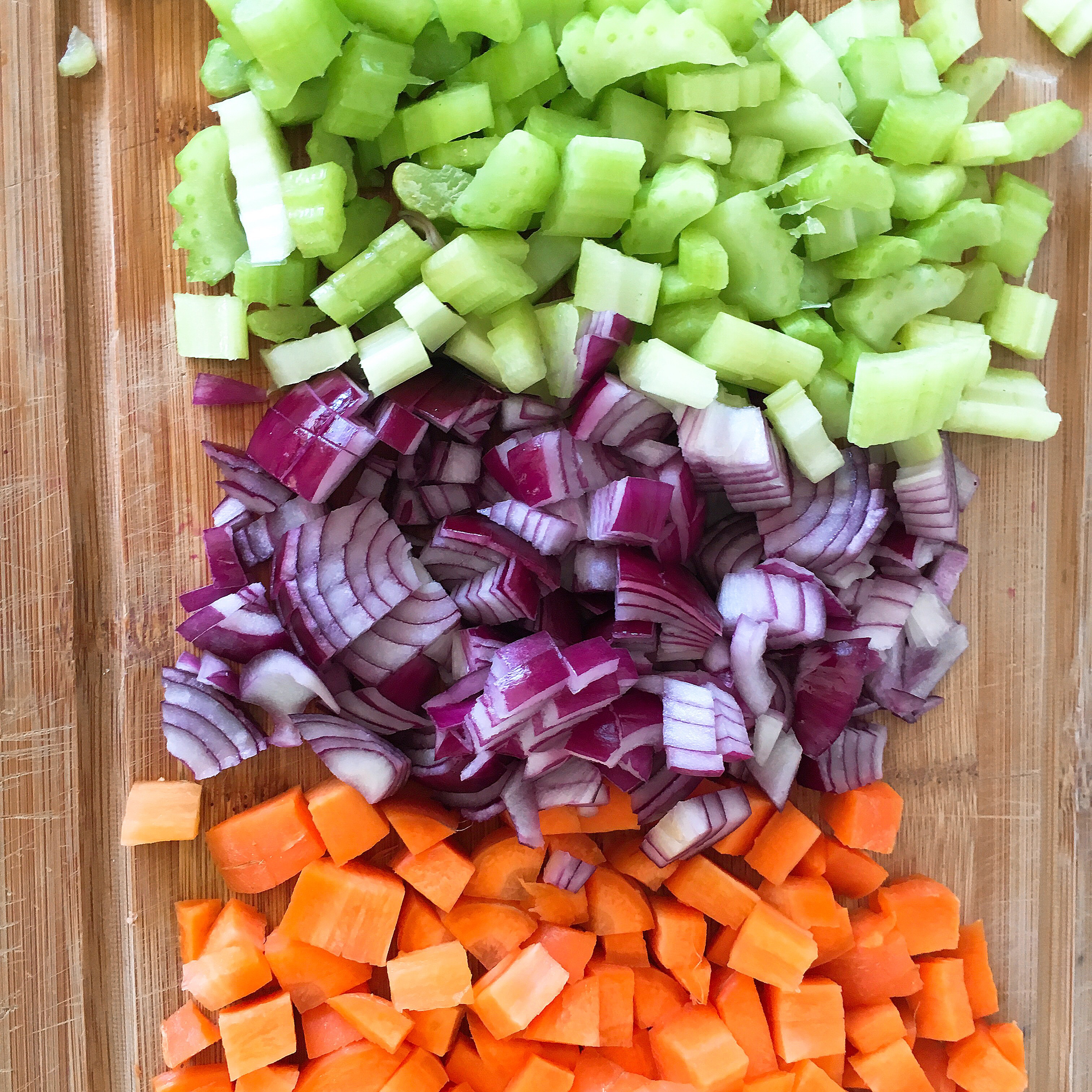 2. Chop your veg and don’t cut your finger off. Sweat the veg in the pan for ten minutes until tender.