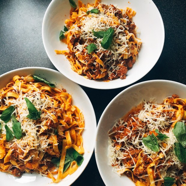 5. Lastly, serve with a thick pasta, lots of Parmesan and fresh basil. The basil cuts through the beefiness and adds another layer of flavour.