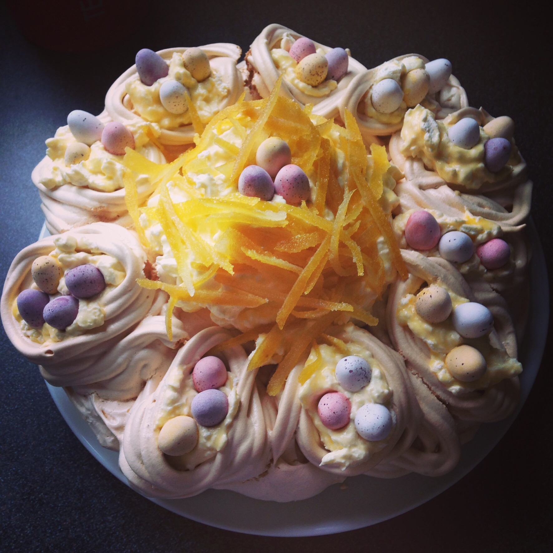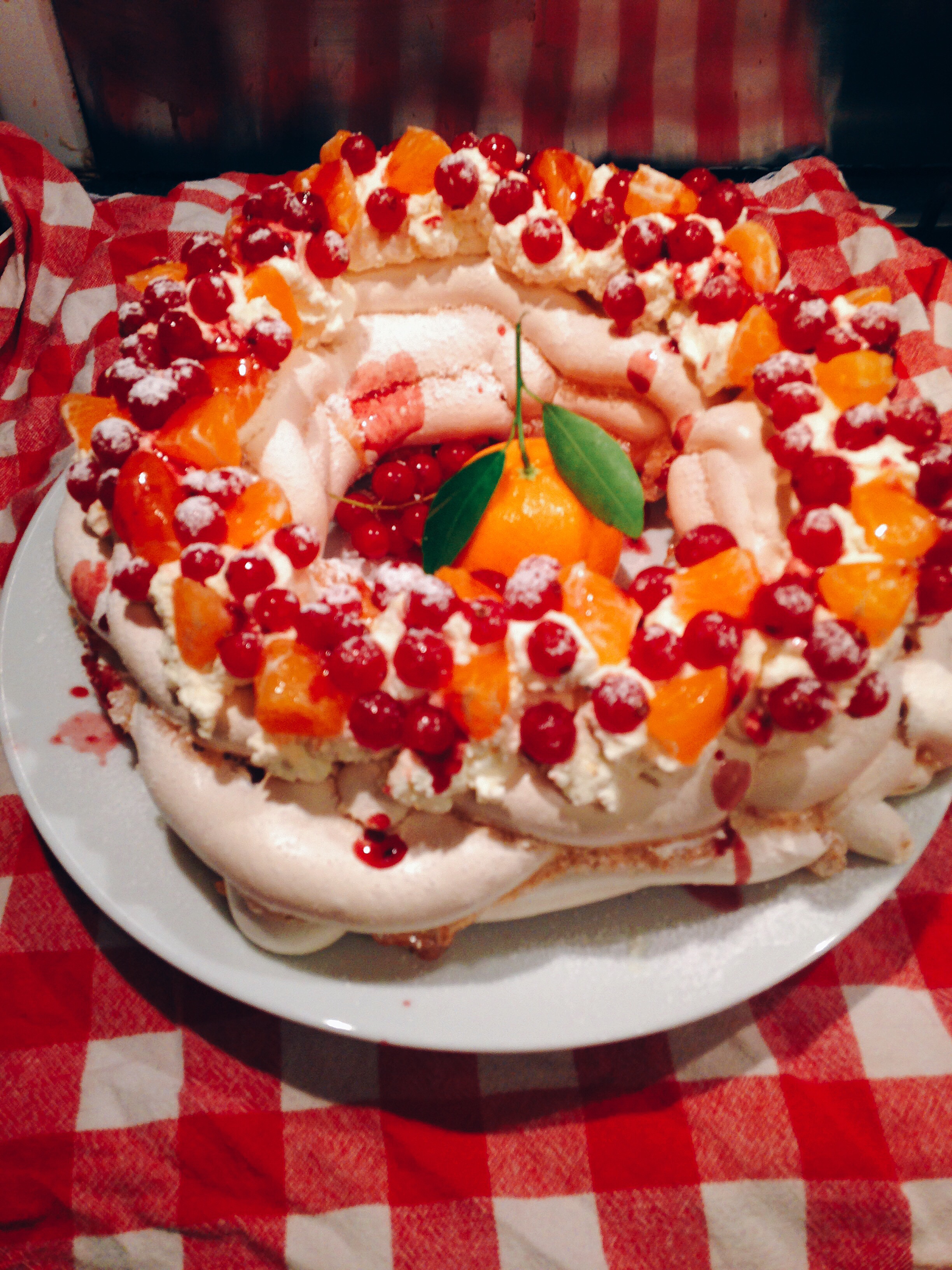 I made these three for my mum’s 60th in January. The top is just strawberries and cream. The middle one is my own Christmas invention: the ‘Seasonal Pavlova’ I put a tbsp of cinnamon in the meringue mixture, then I shape it in a ring to look like a wreath, I add red berries and I chop up seasonal clementines and use some of leaves to decorate. The one closest is the cappuccino pavlova- just add 1 heaped tbsp of dried, powdered instant coffee to the meringue mixture, put whipped cream and dust with dark cocoa powder.