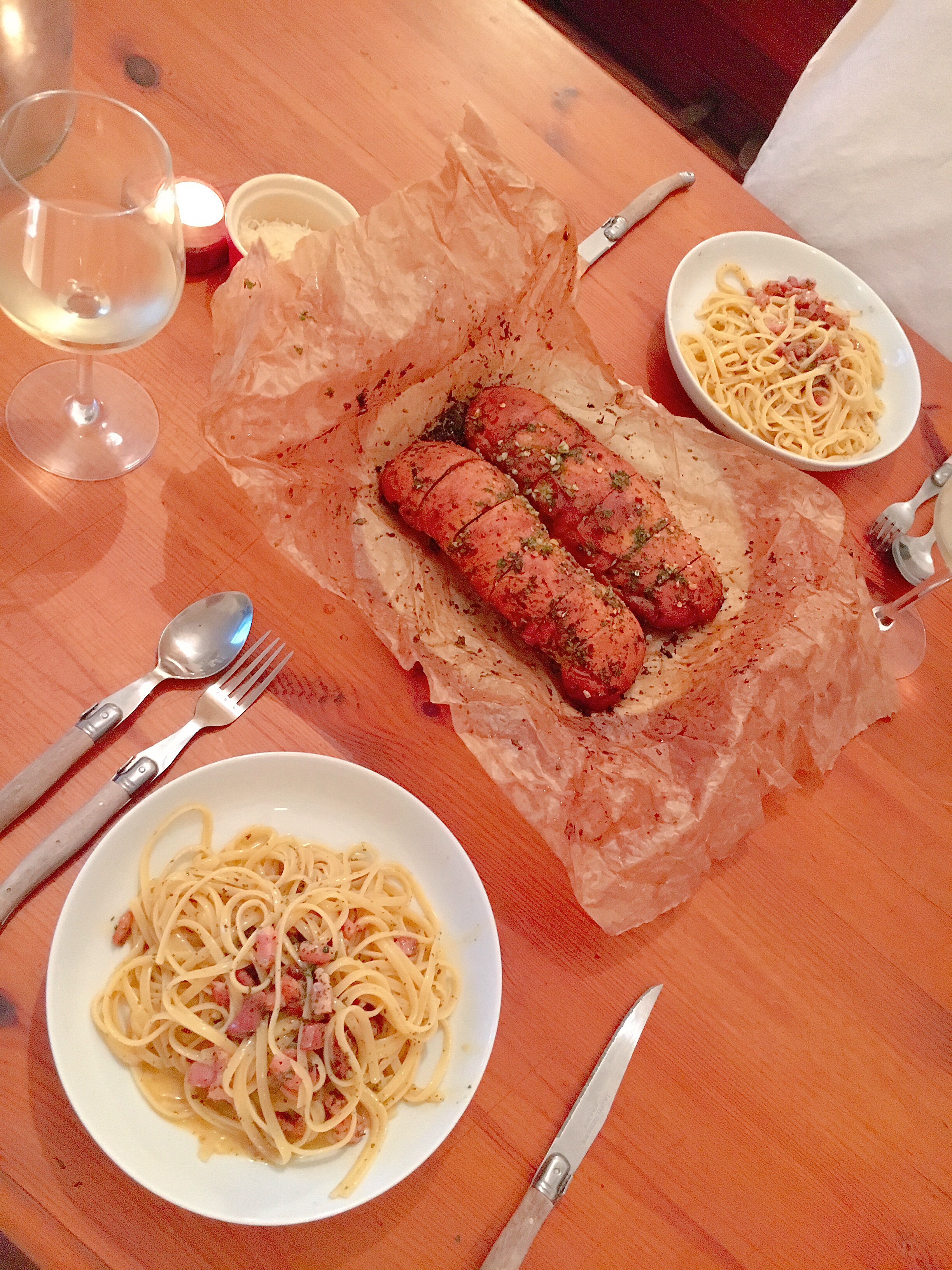 Carbonara and garlic ciabatta