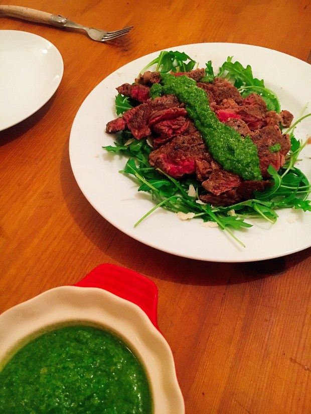 Put rocket on a plate and grate some Parmesan cheese on top, then squeeze some lemon over it and season with salt and pepper. To cook the perfect steak- buy a good ribeye and allow to get to room temperature, then grind salt and pepper on each side of the steak and press it in. Put a knob of butter and a small glug of oil in the pan (butter browns and the oil prevents the kitchen from going on fire). Put the steaks in the pan on a high heat for two to three minutes on each side and do not touch until you’re flipping. Allow the steak to rest for about three-four minutes before slicing. Put on top of the rocket and drizzle salsa verde on top.