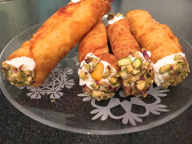 - I use a metal kebab skewer and slide the tube onto it (it’s a really safe way to slide the cannoli in and out of the oil).